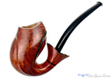 Rich with grain and energetic movement, this fantastical creation from Aleksic is a stunning sculpture of functional smoking briar. While the stummel is actually two pieces, the composition is playful and sturdy. Drilled to the bottom of the chamber, this delightful and clever briar is an art piece, but no less a smoker for being beautiful. Unique and impressive, this organically inspired smoker isn't for the tackle box to take along the fishing trip, but can serve as a proven trophy for the one that didn't get away.