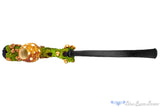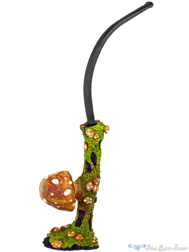 Carved in dynamic, realistic detail, this standing tree stand mushroom sitter from American pipemaker, Brian Orton, is both a celebration of organic fantasy and tobacco enjoyment. Surreal for briar, this standing pipe is carved into a tree's trunk with multiple mushroom caps growing from the moss and wood. A singular large mushroom bowl and a cavalier's engineering make this attention grabber not only fantastic, but a more than practical smoker. The stem, top of the trunk, middle shank and bowl, as well as the stand all break down with tenon/mortise assembly for easy maintenance that guarantees this sculpted smoker will always be ready for another favorite tobacco.