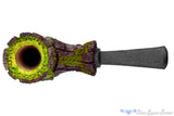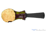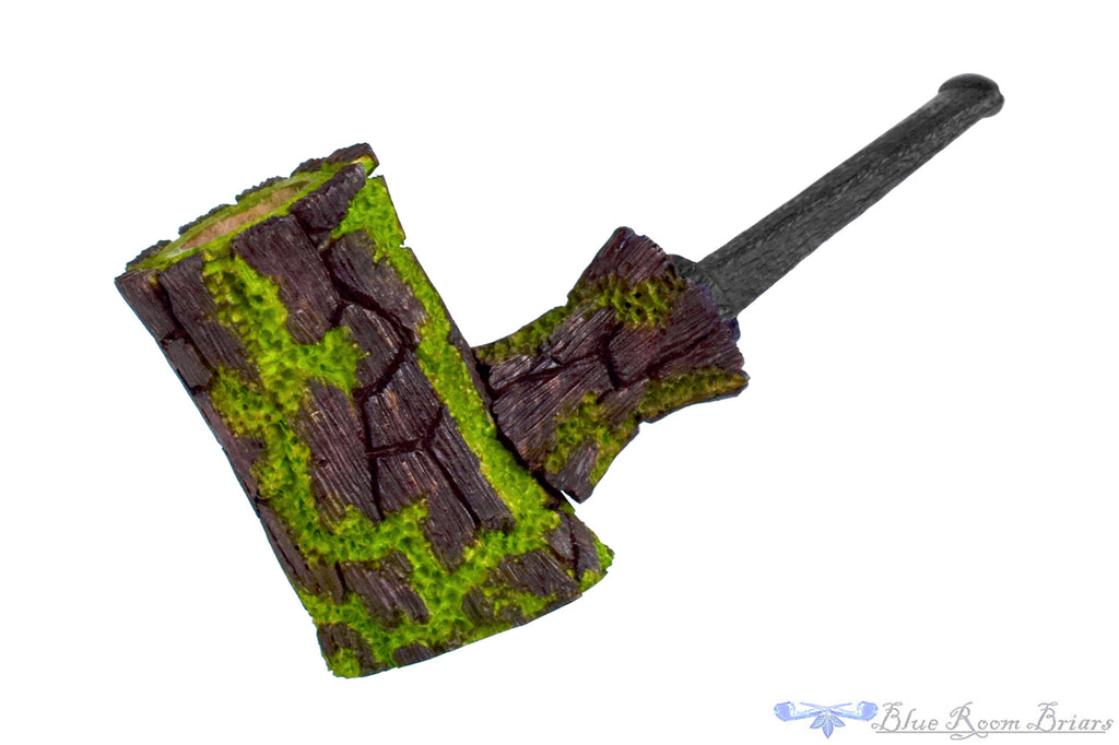 Realistically carved to fool even the closest of inspections, this cherrywood poker from American carver, Brian Orton, is wonderfully detailed and presents as a cracked bark tree trunk covered in moss. The shank is modular and can be removed from both the stem and bowl for easy access to the draft making this briar smoker easily maintained no matter how dirty it may get inside. Inspired by what one might find on a trip through the woods, this well drilled smoker is for those who want to bring a little of the forested wild into their smoking ritual.