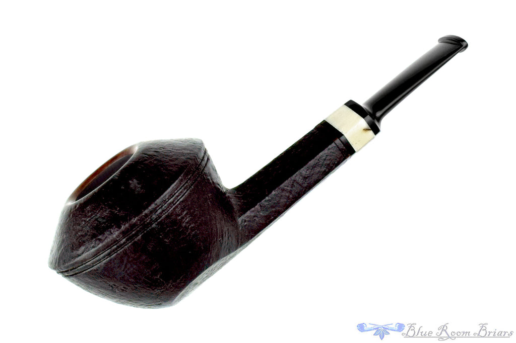 Masculine and shaped with precise and exacting lines that panel the wide shank, this dark blasted rhodesian from South African pipemaker, Charl Goussard has a wide bullcap bowl with the particulars of a diamond shank bulldog. Double beaded around the bowl just below the widest point making it appear even taller, this wide chambered handmade has an insert of ivorite in the saddle stem. Plenty of room in the chamber for those English and latakia tongue friendly blends, this smooth and beveled rim brunette beauty makes a dynamic composition with a stummel that is just a few shades toward burgundy from all black.