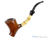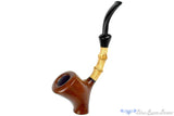 Finished smooth with a low contrast display of straight grain radiating upwards to the bowl's rounded and broad rim, this standing cherrywood handmade from South African pipemaker, Pientenpauw, is dressed with two knuckles of bamboo and even features a military mounted stem that can easily be removed while in use. The heel conveniently has been shaped into a pedestal so this curved and bent beauty can stay standing when empty or full. The sweet-spot sized chamber has a slight narrowing to the draft at the very bottom, but any Virginia or Virginia based blend will be an excellent choice for this smooth drawing smoker.