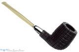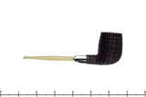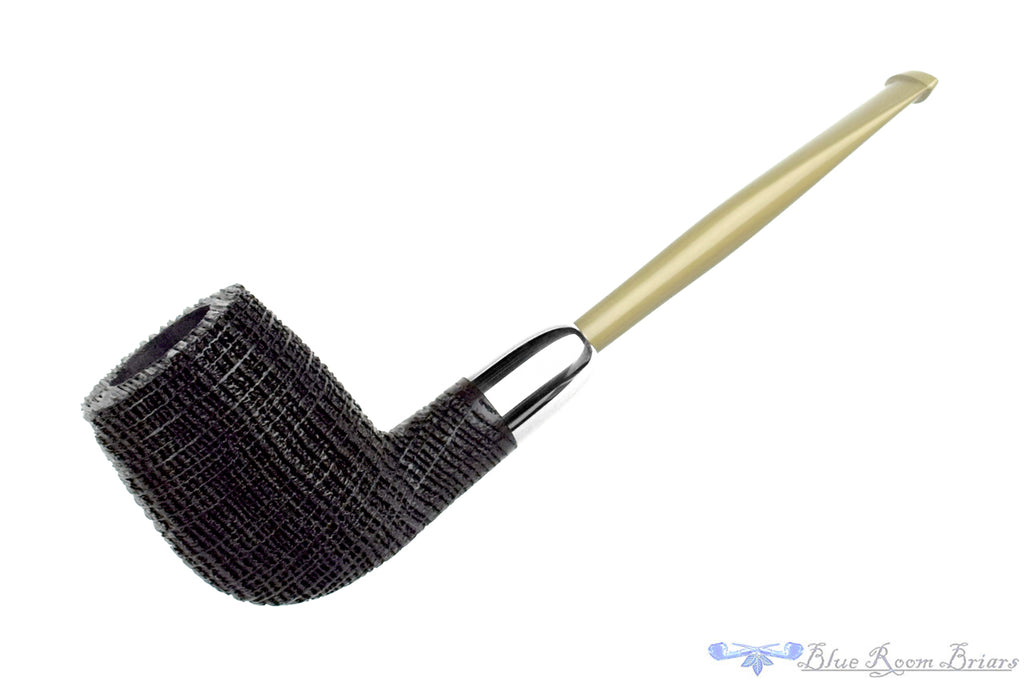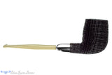 Growing as a living oak tree more than 5,000 years ago, this black morta billiard from Yorgos Mitakidis has been turned into a phenomenal smoking implement and sandblasted to reveal the tight, geometric finish that only comes from the technique applied to this material. Capped at the shank with silver and fitted with a military mounted stem of light and dusty olive ebonite, this gorgeous and classy lightweight smoker has been given a modern dose of style to the sophisticated and clean proportions of the traditional. Narrow in the cylindrical chamber with a round bottom to enjoy a straight Virginia or any fine cut favorite, this stunning and eye catching handmade from Greece is a sure generational treasure.