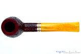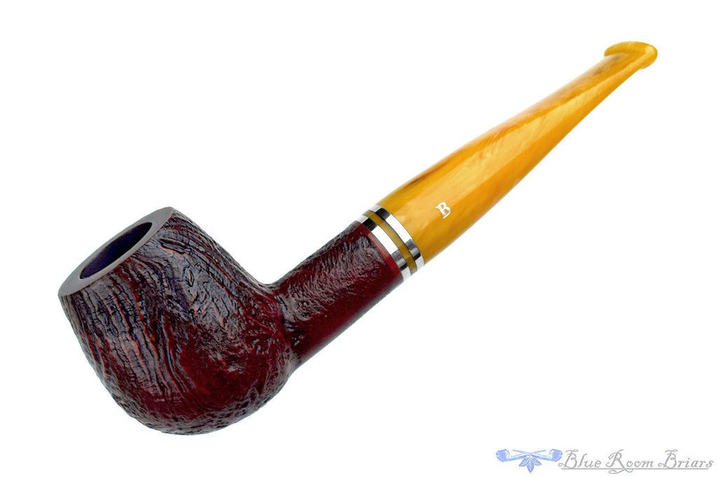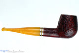 Blessed with a magnificent sandblasted finish, this impressive Onda Morrone billiard from Italian maker, Baraccini is technically somewhere in between a billiard, an apple, and a brandy. What is not in dispute is the fantastic growth rings apparent in this spectacular finish. Trimmed with a double band of nickel and fitted with a semi-transparent stem of sunshine and orange, this striking smoker is in excellent condition with a smooth rim and its original box and sleeve.