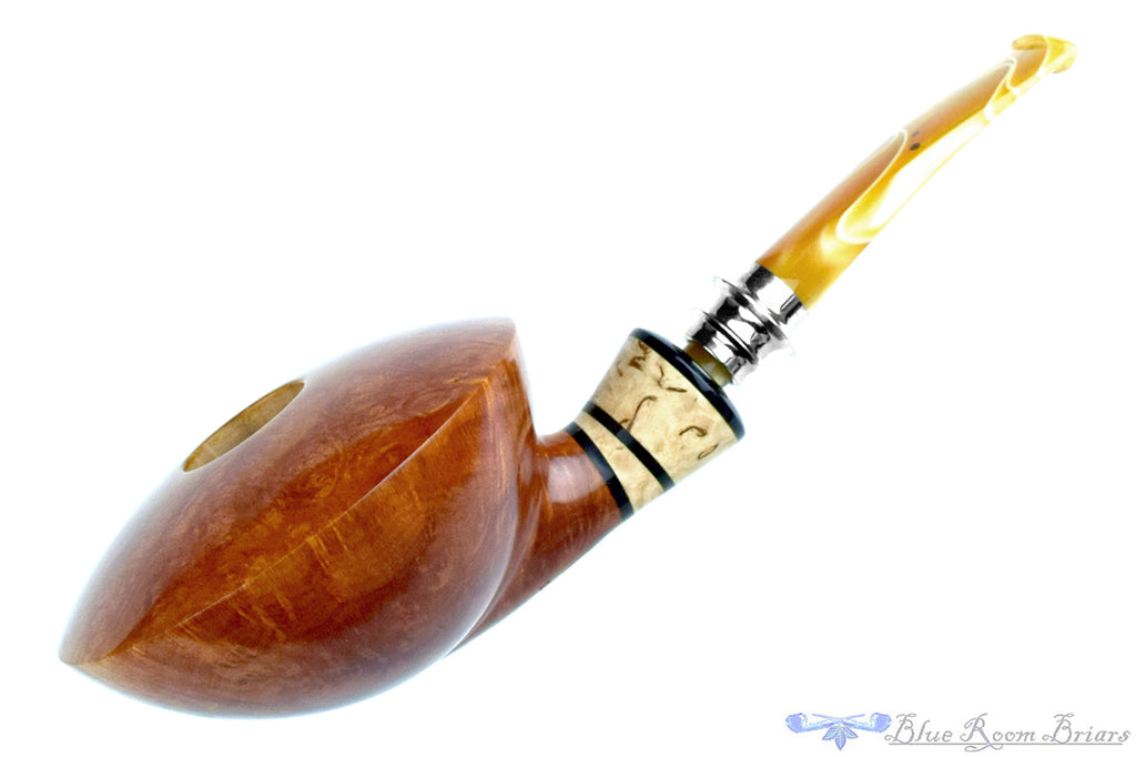Unapologetically wide, this smooth saucer from American carver, Joseph Skoda, is an impressive specimen of briar tricked out for a stunning profile of material and finish. Radiating grain rises from the articulated transition at the bottom of the bowl for a beautifully broad rim of naturally contrasted birdseye, easily mesmerizing even casual viewers. The ferrule is a light wood's burl for a vivid contrast against the ebonite spacers. The stem has been trimmed with silver featuring wide flares to echo and balance the shank's extension. Stemmed with acrylic for a heavy dose of color, this warm toned estate pipe is completely UNSMOKED and the sweet-spot sized chamber will do well with any genre, though practically impossible to smoke hot enough to burn the fingers while being held.