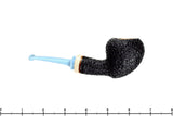 A black and shiny blistered finish graces the surface of this American rusticated and handmade estate pipe from Neal Monier. Capped at the shank with ivorite and stemmed with an eye catching pale sky, baby blue acrylic stem, this thick walled and cylindrically drilled chambered smoker is right in the sweet-spot for size allowing any blend to be enjoyed without being too hot or not enough space to get all the available flavors. In excellent shape, including the polished smooth inner rim that bevels into the chamber, this smooth drawing strawberry will offer an excellent smoke and likely turn a few jealous heads in public.