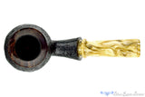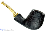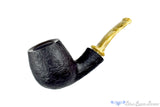 Remarkably lightweight for such a thick walled and full capacity smoker, this handmade black blast egg from German carver, Benjamin Westerheide, features a brass reinforced mortise and a sand and earth toned stem of acrylic. Like all of Benjamin's work, the engineering is superb with a well-cut slot in the mouthpiece and a slight ramping of the airway to ensure passage of a cleaner without ruining the perfect resistance in the draw. Smooth and polished at the mahogany colored rim, this modern design of flared shank and echoed saddle will be long lived as a classic and favorite smoker for generations.