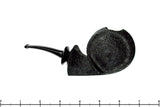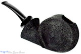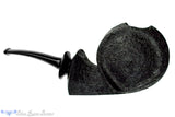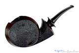 Aside from the shank's face, David left a single panel of smooth that curls up the shank, over the rim, and along beside the bowl to protrude from the bottom of this American handmade blowfish otherwise finished in a straight black sandblast. The echoing curved lines ripple from the back of the bowl, again at the flared shank, and yet again at the sculpted saddle to match, making this well constructed and modern shape a exemplary in its balance and precise composition. A very deep chamber with a sweet-spot sized width will make any favorite blend a fitful companion for such a unique and well composed smoker guaranteed to turn heads among the well versed in briar and those uninitiated too.