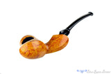 The lines, seams, and curves of this scaled blowfish from David Huber of DSH pipes are nothing short of hypnotizing when examined.  The lack of symmetry pulls the eye into a kind of pace and rhythm as the high contrast finished briar is taken in one piece of comprehension at a time, resulting in a theme of motion and movement.  Of particular note is the sculpted crown of the stem - molten and organic, as if it grew directly out of the briar itself.  Just one more sound argument proving David is in fact a sculptor who just happens to make great smoking pipes as his medium.