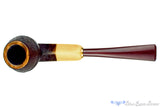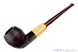 Striking, with a classic rhodesian bowl tightly sandblasted in a dark and rich rusty finish and a red brindle stem to match the lighter tones, this handmade bulldog from Aidan is fitted with a long piece of boxwood along the diamond shank and reinforced with a brass rod raised just enough to claim a little bit of bling from any angle. Even the smooth rim has a vibrant touch that makes this military mount stemmed smoker a dynamic looker with a wide and conical chamber for broad cut leaf of any genre.