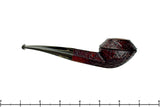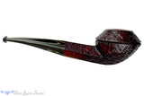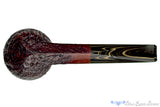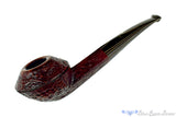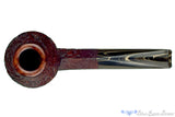 A tad more modern than we usually see from Jesse's workbench, this singe bead and eighth bent bulldog is still dripping with the classic lines and flow of taper that make Jesse's work so recognizable.  Finished in a deeply detailed blast and a rusty dark red finish, this diamond shank smoker has a clean and polished, rounded rim to accompany the use of black/sand brindle in the stem.  Just bent enough to keep clenching comfortable, this old world styled smoker, complete with a modern uptick, will do well with any tobacco and a chamber just deep enough to get an hours smoke at a slow pace.