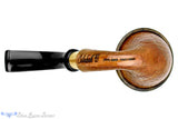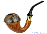 Handmade from a burl of briar as opposed to the traditional gourd, this Calabah Calabash from Johny Pipes is a well constructed smoker, complete with a removable maple moziya rim secured by an inserted delrin gasket and a chamber lined with briar. A wide band of brass adorns the acrylic saddle stem and an additional delrin sleeve secures the integral tenon in the mortise. We particularly like the underbent profile, making this impressive looking briar a good clencher as well. Smooth in the draw, this hollow stummel smoker is guarantee for a sweet, dry smoke without any need for a filter of any kind.
