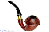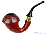 Handmade from a burl of briar as opposed to the traditional gourd, this Calabah Calabash from Johny Pipes is a well constructed smoker, complete with a removable briar rim secured by an inserted delrin gasket and a chamber lined with briar. A wide band of brass adorns the acrylic saddle stem and an additional delrin sleeve secures the integral tenon in the mortise. We particularly like the underbent profile, making this impressive looking briar a good clencher as well. Smooth in the draw, this hollow stummel smoker is guarantee for a sweet, dry smoke without any need for a filter of any kind.
