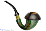 Handmade from a burl of briar as opposed to the traditional gourd, this Calabah Calabash from Johny Pipes is a well constructed smoker, complete with a removable wenge rim secured by an inserted delrin gasket and a chamber lined with briar.  A wide band of brass adorns the acrylic saddle stem and an additional delrin sleeve secures the integral tenon in the mortise.  We particularly like the underbent profile, making this impressive looking briar a good clencher as well.  Smooth in the draw, this hollow stummel smoker is guarantee for a sweet, dry smoke without any need for a filter of any kind.