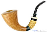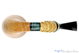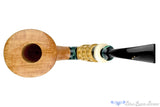 Stunningly smooth and pale, this handmade horn from New York pipe maker, Joseph Skoda, is another among his singular designs and features several materials working in concert to bring this handful of gorgeous smoking implement into existence. The bowl is drilled deep with a draft hole dead center at the bottom and most impressive, the draft to the button is so smooth and polished that a cleaner will pass through to the bowl without removing the stem. Acrylic, bamboo, ebonite, and Ivorite (elforyn super tusk) all cleverly combined mix color and texture together to harness an almost full bend into this American handmade's design. Something we've come to expect and appreciate about Skoda's work that no one else can replicate.