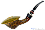 It only takes a brief glance to recognize that this handmade from American carving artist, Joseph Skoda, is a something different. We've been looking at it for over a week since it arrived and every time our eyes fall upon it, another detail stands out. The rim is smooth and obviously very wide, but the color has a mossy tone that is a compliment to the richer brown underneath. Joseph uses a proprietary Gecko finish by carving the smooth briar with a special tool that creates this craggy and tactile effect, as if an oasis has formed over a stretch of dried earth. Trimmed with acrylic, oval shank inserts are wedge shaped producing an exaggeration of a higher degree of bend, all composed with a ring of ivorite and another on the stem, like a rhythmic procession forcing the eye back and forth along the pipe. Even the very thin bead around the rim is superbly articulated making this an awe inspiring smoker that isn't just gorgeous, but made to be a favorite when both in use and on display.