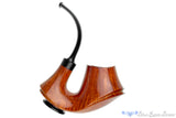 Looking as if a simple and smooth volcano shape was bent and twisted into this compelling and overbent smoker, Marek took this shape a step further by adding a cavalier type carburetor where the draft from the bowl meets the draft from the stem. The bottom cap can be removed and a cleaner can clean both without ever having to remove the stem from this sculpted and well grained beauty. Straight grain wraps around the top of the stummel while the entire bottom is encased in birdseye end grain for a spectacular presentation of beauty only found in briar and oriented as a good handmade should be.