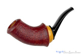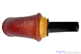 An even and rusty red sandblast graces the entire tubular stummel of this handmade reverse calabash McIKL pipe from Czech pipe maker, Marek Cikl. The chamber itself is modestly deep at just over an inch with a width to accommodate a strong English or broad leaf blend, but the prize is the massive reverse calabash chamber inside the briar and extended through a large boxwood ferrule. Well designed with a smooth draw, this unique briar won't smoke for hours at a time, but is guaranteed to provide an exquisitely dry and sweet smoke.