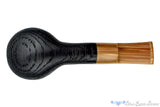 Stunningly consistent and perfectly oriented to a meaty and thick walled shape, this morta pipe from Ron Smith has been sandblasted to reveal the uniquely interesting results that can only come from the bog oak. At five thousand year old, this vessel was alive and growing in the natural world back when they were just starting to think about growing monolithic structures, like Stonehenge. Fitted with a nicely toned acrylic stem, this saddled clencher is just deep enough to be enjoyed for an hour at a time, but features a perfectly shaped chamber for getting all the nuances of flavor from any blend.