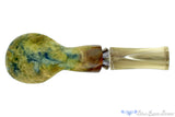 Finished in a special method to reveal the tactile briar's grain, this Driftwood bent egg from American pipe maker, Ron Smith has been given his unique coloring of tans, blues, and greens. Fitted with a flared saddle stem of acrylic in a champagne marble color, the slight bend and cant of the bowl work well with a wide bit for a comfortable clencher with a nice sized chamber. Easy and open in the draw, this American-made briar will do well with a good burley, dark fired or an aromatic guilty pleasure.