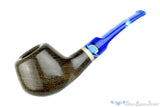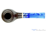 Made from morta and acrylic, this Ranz Freehand from Tennessee carver, Ron Smith strikes a dynamic and dual toned presentation with the dark bog oak and the deep blue of the acrylic stem. Further adorned with an insert of ivory acrylic, this big bowled beauty is sure to impress from close up and far away. The wide chamber has plenty of room to handle all the flavors from an English or Balkan blend and the well drilled draft is open and smooth enough to easily handle a tongue friendly aromatic as well.