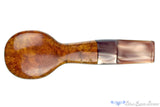 Flared in the shank and finished smooth with plenty of contrasting straight grain wrapped around the Vesuvian bowl, this acrylic stemmed and stout smoker from Ranz Freehand maker Ron Smith has a good sized chamber with straight, parallel walls getting thicker to the bottom. Drilled to the bottom with a smooth, open draw, this American handmade is highly recommended for our native burleys and a good, clean aromatic.