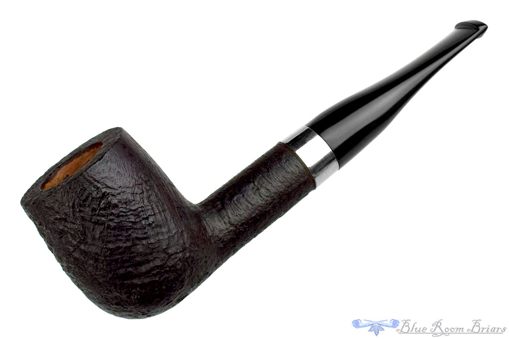 The Elijah Cole series of pipes, as pictured here with this large and nickel banded billiard estate pipe, was the loving brainchild of late American pipemaker, Bob Clark. This completely UNSMOKED and sandblasted billiard is well drilled with an excellent draw from the wide and deep, cylindrical chamber. There is likely too much heft in the thick and sturdy walls for long periods of clenching, but this tapered smoker from Rhode Island is still comfortable between the teeth for a time and is of course, in pristine condition.