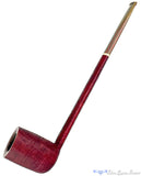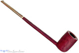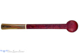 Marvelously long and featuring a majestic oval shank that bares a remarkably well done taper, this large Scottie estate pipe from Kansas City carver, Scottie Piersel is trimmed with her signature use of ivorite and a bit of limited edition brindle stem.  The vivid color finish is like a weathered variation of vermillion that catches the color differently in direct lighting but still matches the tones in the color heavy brindle.  A cylindrically drilled chamber is deep and easily wide enough to handle any broad leaf blend, especially a favorite tongue friendly tobacco.  Wonderfully smooth in the draw, any blend will do well here, though building a large ember is always part of the smoking experience.  This pipe is in excellent condition with just a whisper of inner rim darkening.