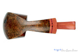 An unusual variation of the neo-Danish shape, this blowfish is turned sideways at the bowl in an attempt to catch as much perfect grain orientation as possible, which any pipe maker will tell you is the whole point of the shape. Densely grained with a touch of spot carving on the front of the bowl, making this beauty true Marilyn (after Ms Monroe's beauty mark). Stemmed with brindle, Andrey inset another darker shade of slim ebonite into the saddle, echoing the lines of the bowl. Wide in the chamber, this perfectly drilled smoker is another brilliantly engineered smoker worthy of passing down and enjoying for generations to come.