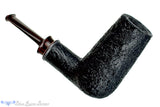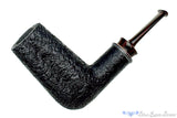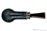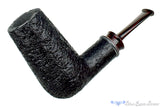One of Bill's signature shapes, this tall billiard is finished with a distinctly detailed black sandblast and with a nice sheen that will survive many years of regular use. Adorned with a ring of fordite, which is thick enough to cover the shank's facing, this narrow chambered brow burner also has a crown saddle stem of 8 swirl classic brindle ebonite. Startlingly deep, Bill flexes his craftsman muscles by placing the draft hole perfectly at the very bottom of the bowl and has, as expected, engineered a marvelously smooth draw guaranteed to excite the most finicky of briar smokers.