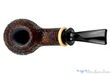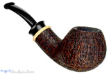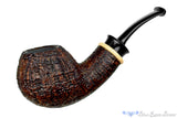 Densely grained with a detailed ring blast gracing the whole of the stummel, this richly colored handmade from Bill Shalosky has a clean ring of boxwood as an accent giving the rusty color plenty of pop. A crown saddle stem and a wide chamber make this easily clenched briar a comfortable addition to any enthusiasts collection who expects their briars to smoke every bit as good as they look.