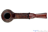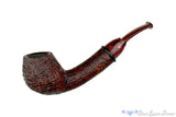 A bit of contrast in the sandblast finish and a long, round shank with an elongated cookie jar saddle in the brindle stem make this handmade from Bill Shalosky look a little longer than it actually is. Adorned with a ring of African blackwood, this deeply blasted bent is both rugged and refined. Light enough to clench for an entire smoke, this sweet spot sized chamber is tapered to the bottom and recommended for both flakes and virginias.