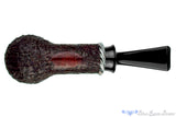 A narrow and tall chamber housed in a thick walled bowl that softly tapers to the rim from the rounded heel, this brow burner from Bill Shalosky is made to be further captivating with a ring of fordite that pops hard against the cordovan sandblast finish. Perfect for virginia based blends or a shag cut, this American handmade can keep even a quick paced puffer pacified for long periods of pipe smoking satisfaction.
