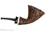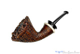 Beautifully sandblasted to capture dense and cascading growth rings that cover the entire stummel, this plateau rimmed dublin from American pipe maker, Bill Shalosky, is finished in a contrast of rich, warm tones punctuated with a ring cap of deer antler. Fitted with a black, crown saddled ebonite stem, this lightweight clencher has a conical chamber with a perfectly placed smooth and open draft at the very bottom. Highly recommended for display, this singular briar of unique and inspired function will also make any enthusiast's favorite rotation.