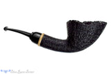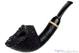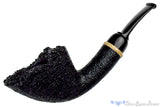Big and thick, this massive fan dublin from world-famous Tennessee carver, Bill Shalosky, is sandblasted and finished in a true black. Adorned with a ring of pyinma burl and fitted with a cookie jar saddled stem, this magnificent briar specimen has more than 50 years of growth displayed in the tight ring formation cascading down the bowl and shank. Perfectly drilled with a draft hole at the bottom, dead center of the conical chamber, this handful of dark smoking bliss deserves a thick cut or broad leaf to really show off, though the draw is so smooth any blend worth a large ember will do marvelously.