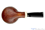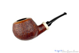 Massively thick in the bowl's walls, this compact and ringed cannonball from Tobias features a sandblast and contrast finish with a domed rim that has been polished smooth. The deceptively simple and saddled stem takes a secondary role to the large ring, small bent shank, and handful of bowl on this well constructed briar. Just bent enough to keep comfortably clenched, this German handmade is an impressive offering regardless of the smoker's preference for holding hands of hanging from the jaw.