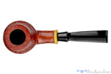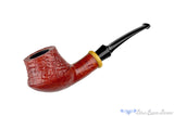 Technically a rhodesian shape, this tall bowled handmade from German carver, Tobias Höse is built like a cup and volcano. Trimmed with a uniquely patterned wood ring, this single beaded smoker is both modern and Danish inspired. Light enough to clench throughout the smoking session, this red blasted gem has a preference for virginias given its narrow chamber, though a flake will do quite well here too.