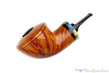 As rhodesians go, this smooth finished and high-contrast handmade from Bonsai Pipes' Tobias Höse is a stout shape with mightily thick walls and a breathtaking display of grain oriented to the shape in amber and wheat honeyed tones. The end of the shank is adorned with a large band of ebonite and a cap of stabilized burl, created from a process of heat and pressure that infuses the wood with the colorful acrylic for a bold statement of color and design. The low bead travels around the top of the bowl while the high bead encircles the rim for a classic look on a very modern variation. Even the chamber looks small in comparison, though wide enough to enjoy a broad leaf or even a folded flake, drilled with a conical bottom and draft hole right where it should be, this German bullcap will be just as lovely to smoke as it is to see in direct light.
