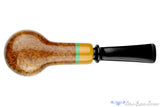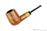 Finished smooth in high-contrast, this Danish tan billiard from Brian Madsen has an insert and shank cap of colored ebonite - the same material as the crown saddle black stem. Wide in the chamber behind the large bowl's thick walls, this clenchable billiard has plenty of room to keep any broad leaf blend simmering with a flavorful ember. Densely grained with a tight swath of birdseye all along the bottom of the stummel, this colorful smoker will draw some attention, though with such a smooth draw, once lit it will practically disappear.