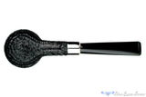 Simple and classic, Brian has used his scalloped rustication to dimple this smooth rimmed and adorned apple to a rustic variation of the stylish shape. Fitted with a nickel silver band to cover the shank's facing, this alloy will not tarnish like straight silver, keeping the pipe in pristine presentable condition for much longer. What drew Brian to us is evident here with his masterfully cut handmade stem featuring an open slot and a very smooth draw, key indicators of a soon to be favorite smoker in constant rotation for generations.