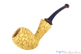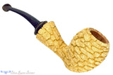Meticulously finished with a deep carving and a driftwood finish to highlight every single individual striation of grain, this bent acorn from Brian Orton is nothing short of spectacular in its distinct detail. The carved stummel resembles cobbled or stacked stones and the pale finish is always welcome, especially when lighter than the original briar. Event the soft and comfortable stem has been sandblasted to give it a weathered look equal to the distinct stummel. Drilled with a draft straight down into the chamber, this cylindrically designed American handmade is destined to make smoking the last morsel of tobacco easy with a minimum of relighting.