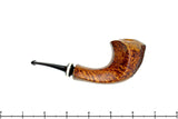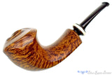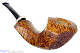 Sometimes it is like magic. A particularly good block of briar, which any pipe maker will tell you is all too rare to see through to the finished shape, presents itself and the artist's mind's eye begins to see the possibilities. The promise of an image is formed in the creative ether, unfortunately often modified to adjust for the imperfections inherent to any organic material. In this case, Kent's vision crystalized into this truly remarkable and sculpted pulchritudinous puffer. The briar's natural density and orientation is consistent, dense, and flawless. The sculpted contours of this amazing pipe are present everywhere, from the definition of the subtle ripples in the rim, to the perfectly placed seams that delineate the panels framing all of the beautiful birdseye and straight grain. Finished in high contrast to showcase both the briar's character and the brilliance of the proportions. The amazing stem work is evident in the deep slot and shaping of the classic brindle with an insert that is so well done, we're not entirely sure how he pulled it off. The matching deep burgundy tone a perfect match to the finish and the use of plateau on the front of the bowl - as if the flame grew to wild and upon creation, split the wood itself. Remarkable and amazing, this heirloom quality showpiece isn't just for show, it is a true smoker, engineered with every possible nuance to be a gorgeous smoker for the ages. Bravo, Kent! Bravo!