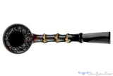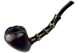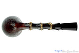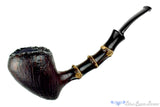 Given the natural colors present after harvesting, we are surprised that most bamboo in pipe construction is the lighter variety as opposed to this handmade from American pipemaker, Chris Martin, that features the dark, or black, variety. The details of the knuckles are almost highlighted while the shank in between is a deep, dark brown matching some of the tones in the sandblasted bowl. Topped with plateau, the deep chamber is conical in design and has a draft hole dead center at the very bottom. Passing a pipe cleaner with ease, this bent and refined handmade is a boon for any aromatic or burley based blend with a consistent draw and flavor producing smoke from start to finish.