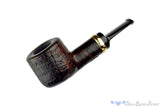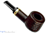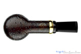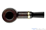 Extremely thick in the walls, this sturdy and American-made pot sitter from Chris Mattioda has a distinct sandblast finish that manages to show off both a straight grain orientation and plenty of growth rings cascading down the side of the bowl. The thick bowl itself only has about two degrees of cant giving this round shank smoker the straight A look of a clean and well executed shape. The large brass ring at the end of the shank adds a degree of length to the eye's perception and the soft bevel of the round saddle is a very nice touch. Dark and rich, this pot sitter has a chamber just wide enough to get all the flavors from a favorite English, Balkan, or even a Danish aromatic, though any blend will do well with this smooth and satisfying draw.
