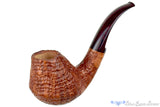 Sweeping along its undercarriage in a curve met by the half saddle stem of ebonite brindle, this beautifully sandblasted and handmade volcano from American pipemaker, Chris Morgan, is both balanced and well bent.  Heft from a thick wall is offset with so much bend making this ring revealing smoker a joy to keep in hand and comfortable to clench.  Like all of Chris's pipes, this bent beauty is well drilled with a flawless draw and can even pass a cleaner all the way down to the capacious chamber.