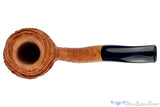Inspired by and made for Halloween 2023, this wavy and curvy shank egg has been shaped to present as a normal curved shank from the site profile but wavy from the top and bottom. The pipe features Chris Morgan's BD Blast. This finish is blasted, deeply and meticulously carved with extreme attention to the grain, and then blasted again to get the maximum craggy depth. The sensation in the palm is magical and the brindle stem is a dark blue and black that is very subtle until seen in direct sunlight.  Light and bent enough to keep comfortably clenched, this American handmade does not have a bowl coat but plenty of thick and insulating around the bowl guarantees that it doesn't need one.