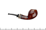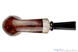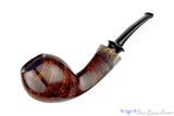 Beautifully finished smooth with a spot on orientation of front to back cross-grain, this handmade from German architect and pipemaker, Dirk Heinemann has an interesting and unusual cap of horn at the end of the shank. Seamed on both sides of the shank from the rim's raised bevel to the very end of the horn extension, this smooth and clenchable briar is an impressive statement of rough hewn refinement. A sweet-spot sized chamber is suitable for almost any blend and clenchers will find this fine drawing instrument of savoring tobacco bent enough for comfortable interrogations of their favorite blends.