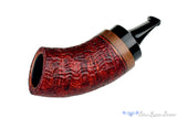 This is not your father's pipe! While its design is almost mind bending, its use is extraordinary. I prefer to think of all underbent pipes as hammock pipes due, in no small part, to the fact I have access to a hammock out back under a tall shade tree. Many bowls have been smoked in that spot while enjoying both the cool breeze and rich flavors that must be smoked outdoors due to certain social restrictions. A classic shaped pipe never fails to disappoint when smoked by a clencher while in a reclined position. This shortened wonder solves two very frustrating problems: The underbent bowl won't dump ashes back into the smoker's eyes when reclined, and the shorter pipe, with a lower center of gravity, is significantly easier to keep working while in that particular relaxed position. Deep blasting and a rough hewn adornment of mahogany matched to a stem made of the finest German ebonite, the craftsmanship is nothing short of spectacular. With deep red tones and a soft bend, this bit of bent tube is easy to show off and marvelous to hold...whatever position you choose to relax in.