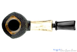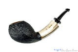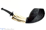 The antler shank on this black blasted cobra from German carver, Dirk Heinemann, is thick and particularly pale with natural grooves showcased in the natural material. The sandblasted bowl has growth rings oriented to the shape and causes the two seams to seem a little wider, as if swollen out from the bowl. Smooth and beveled on the rim, this swooping bent shape is almost sinister in proportion and as expected from the exceptional artisanal craftsman who made it, features a marvelously drilled sweet spot sized chamber and open smooth draft.