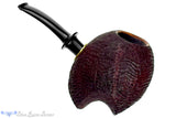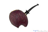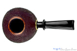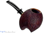 One of Dirk's more interesting trademark shapes, this sandblasted Grainbug is dressed in cascading growth rings save the narrow, smooth, and beveled rim. Reinforced around the mortise with brass tubing, this flared saddled stem smoker has a wide chamber for building large embers and the natural taste of tobacco found in English and Balkan blends. It will sit on the flattened surface beneath the stummel and no matter how its displayed, makes quite an impression resting on the mantle or solidly in hand while being smoked.