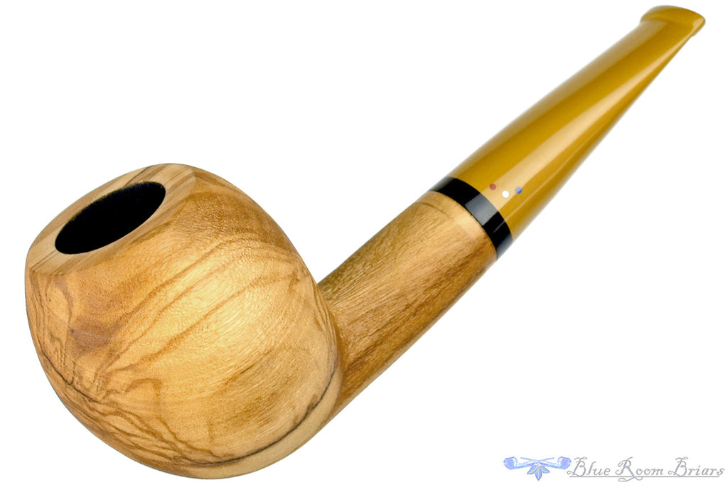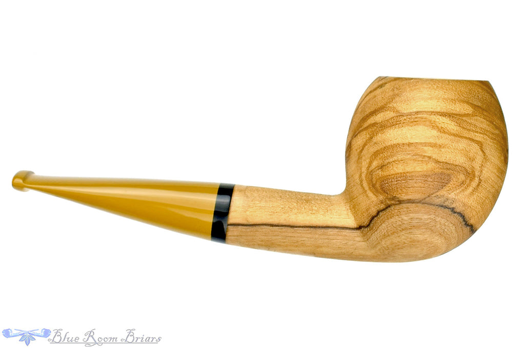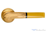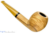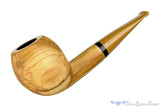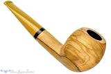 Clean and warm is with a caramel colored stem of ebonite, this handmade olive wood sandblast from Dr. Bob features an insert of black ebonite in the stem and an enormous bowl. The particular specimen of olive wood has a reddish tone as opposed to the much more common green and, like looking at a breakfast plate stacked with pancakes topped with butter and syrup, oozes with comfort and the delicious offerings only a great smoker can provide. Plenty of room in the thick walled chamber for any favorite blend where a larger ember is agreeable, this beautiful apple will color over time with regular use to a darker and richer hue.